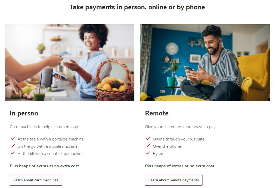 As part of Fiserv, Paymentsense offers payment processing on all major debit and credit cards for most types of businesses. Their advertising particularly focuses on enabling merchants to take payments in person, over the phone, and online. For in-person payments, they offer Ingenico card readers in portable, mobile, and countertop options. For online payments, they offer e-commerce shops, their own payment gateway, and the ability to pay by email. Their phone option uses their proprietary virtual terminal.